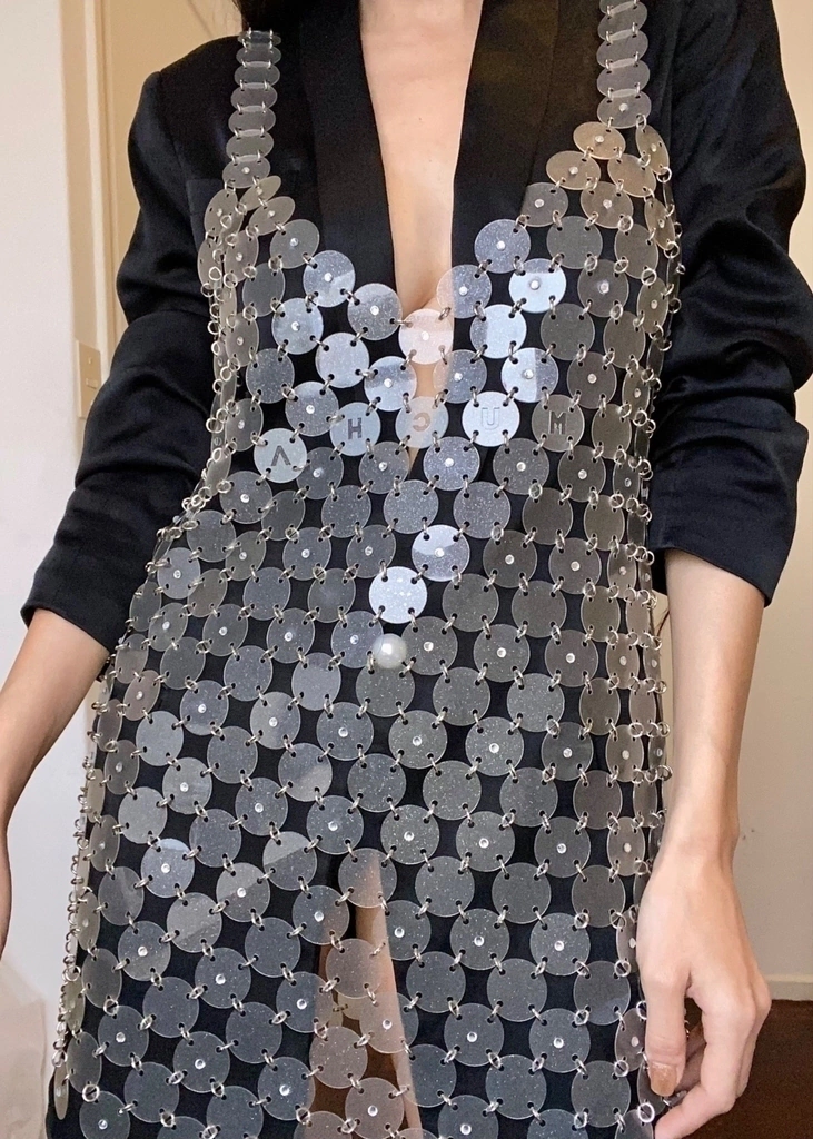 · Vestido brillante: piezas geométricas transparentes con glitter, realzadas con strasses aplicados a mano para un acabado deslumbrante.