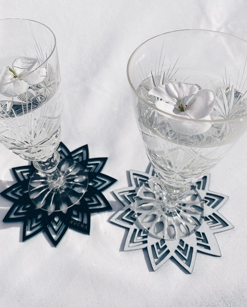 Detalles que hacen que tu vida cotidiana sea más delicada. Set de posavasos reversibles X4 El amor es doble: Negro mate/blanco glitter Tamaño: 12 cm x 12 cm Ideales para combinarlos con los posa platos "Dalia". Encontra más objetos de diseño en @mucha.home